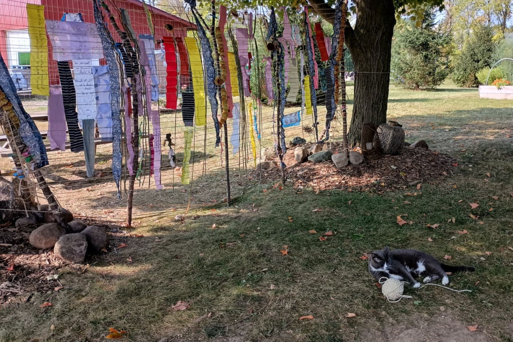 Kids especially loved unwinding large balls of yarn (and Ghost cat too), and knotting many small fabric scraps together before weaving in these long rainbow pieces.