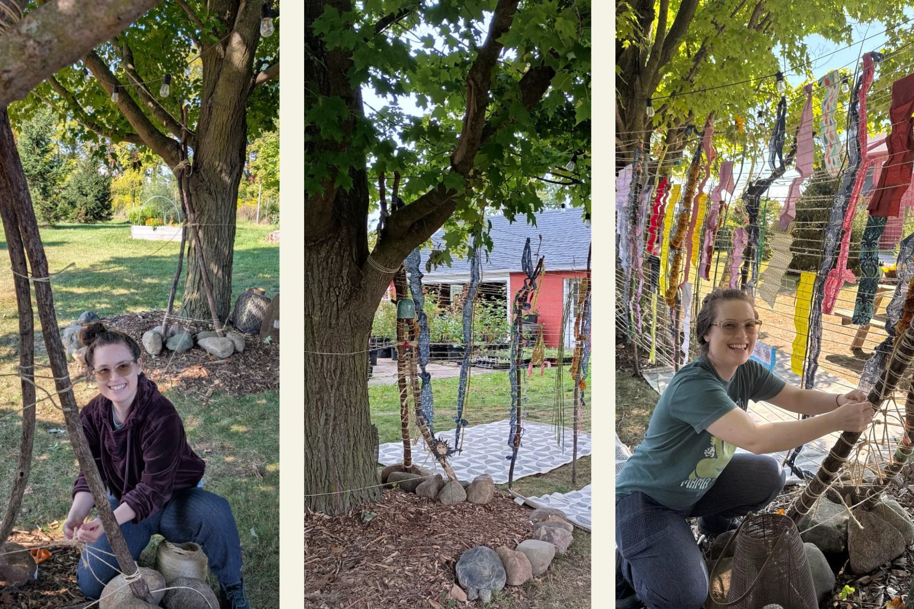 In its earliest form, the loom was imagined as a child’s craft—simple and personal—inspired by an idea in Make Art with Nature by Pippa Pixley. But as we built it, the scale shifted, and so did the meaning. Rather than using twigs for a handheld loom, we used branches from a crew member’s backyard—once part of an “Eeyore house” structure built during imaginative play. From these humble, whimsical beginnings, the loom grew in scale, stretched between two strong Maples, inviting in individual and collective weavings of materials and stories.